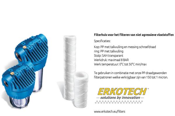 Robust filterhuis met messing aansluitingen voor het filteren van diverse vloeistoffen. Te gebruiken in combinatie met draadgewonden of melt blown filterpatronen.