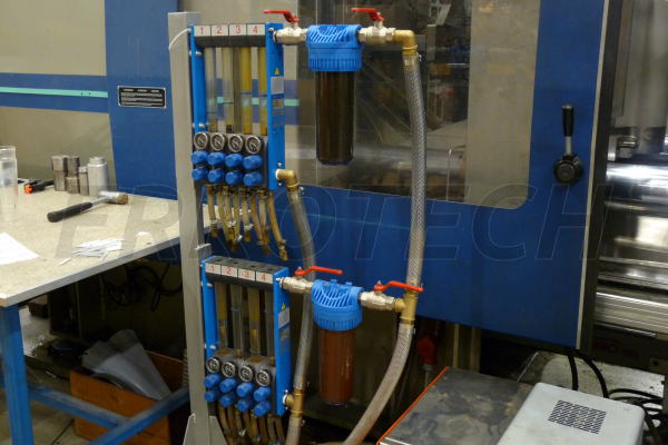 Filterhuis met sleutel op flowmeters van een spuitgietmachine. Door het plaatsen van onze filters houd u uw koelsysteem, matrijzen en heaters schoon.