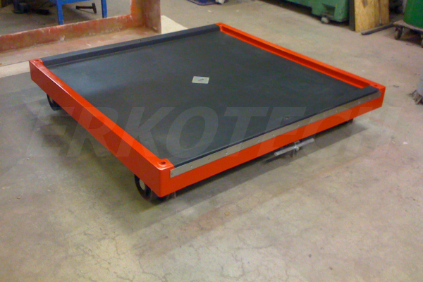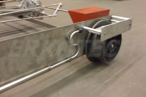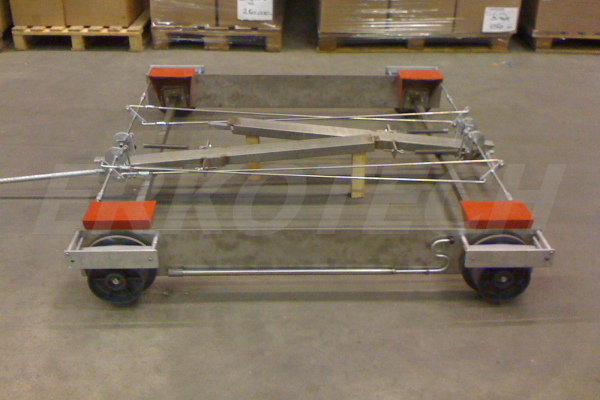 Het onderstel van de lorrie. De trekstangen worden opgeborgen in de trekstangkokers, op dat moment staat de lorrie automatisch op alle vier wielen geremd.
