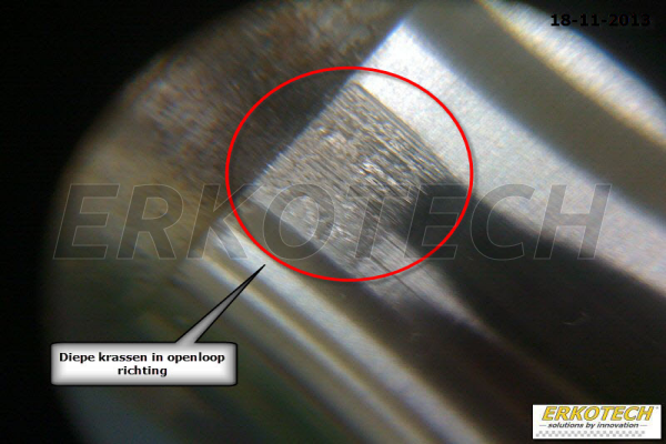 Een close-up foto van een beschadiging welke vliesvorming op het dunwandige product zouden kunnen gaan veroorzaken. Reparatie dient direct ondernomen te worden.