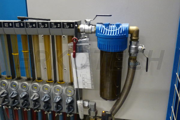 Filterhuis met sleutel op flowmeters van een spuitgietmachine. Door het plaatsen van onze filters houd u uw koelsysteem, matrijzen en heaters schoon.