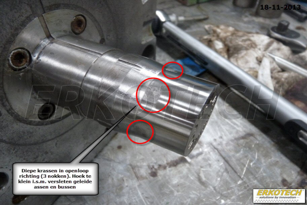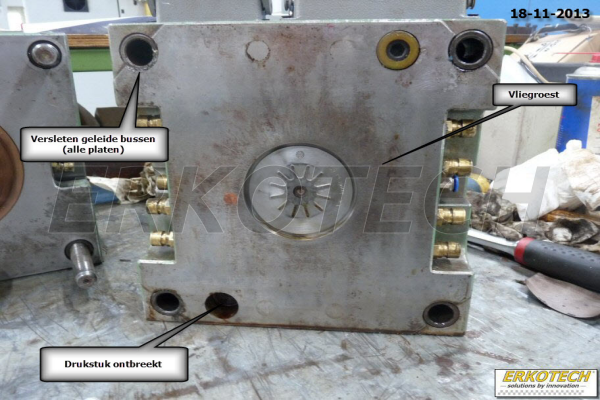Deze (meerplaten) matrijs heeft veel geleidingen welke tijdens onderhoud gecontrolleerd moeten worden. Delen die verdacht zijn worden in dit geval preventief vervangen.